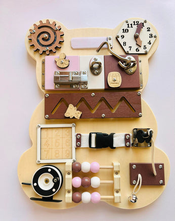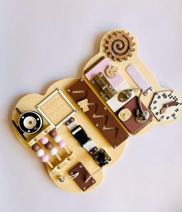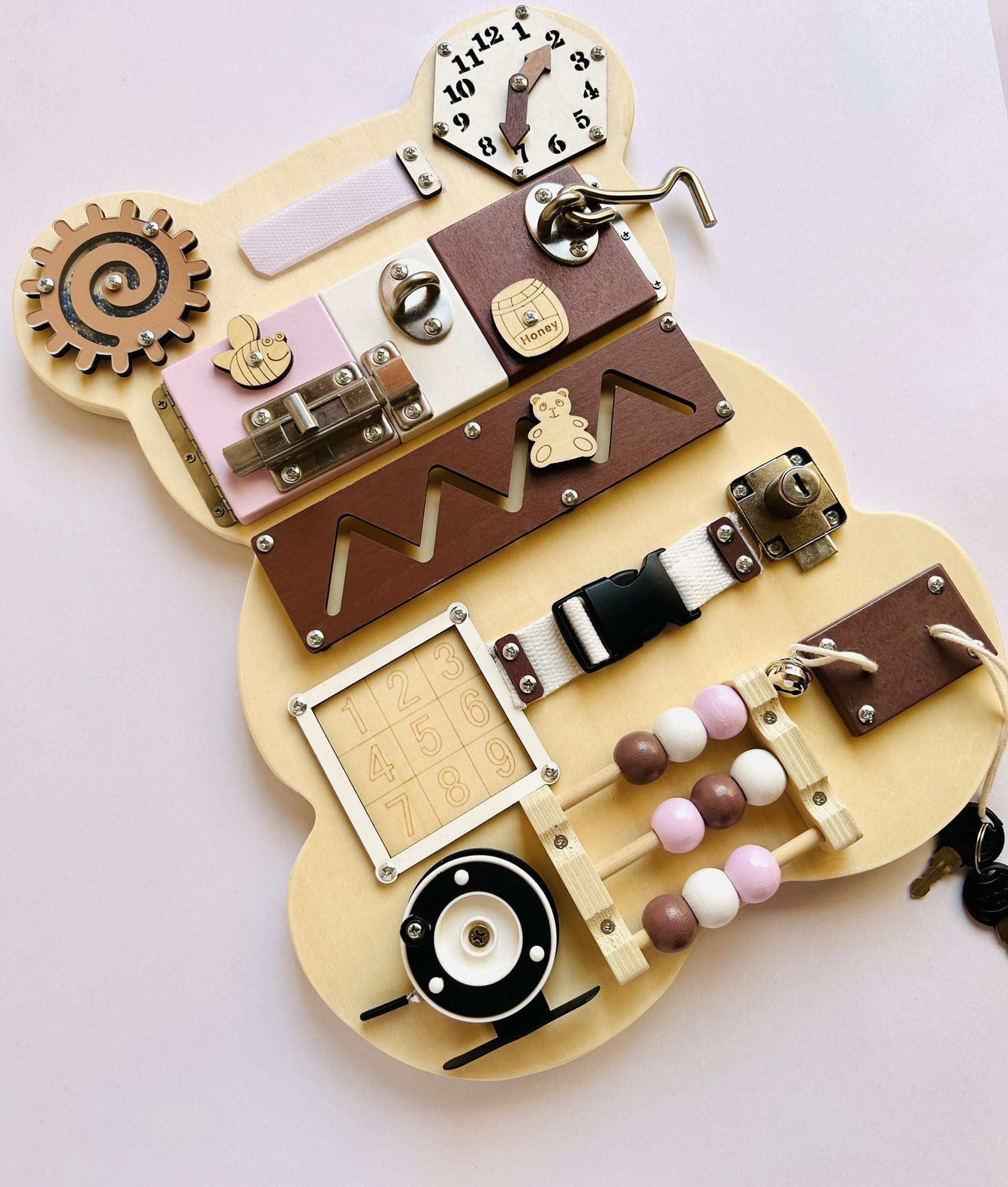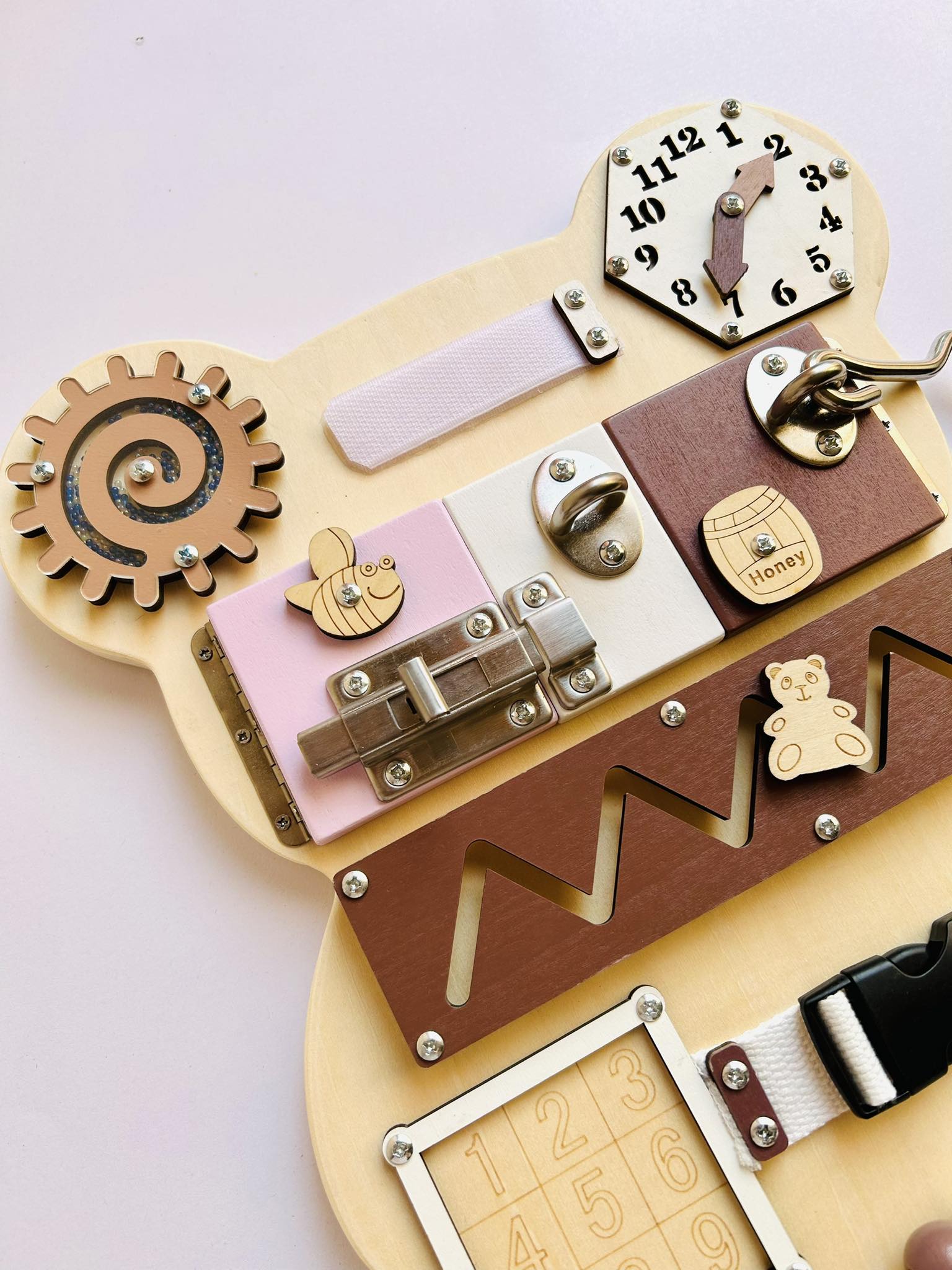 Con una variedad de elementos táctiles, desde cierre, hasta engranajes giratorios, cada componente está diseñado cuidadosamente para fomentar el desarrollo cognitivo y motor de tu bebé. ¡Además, con colores vibrantes y diseño encantador, nuestro Busy Board es una adición visualmente estimulante a cualquier espacio de juego!