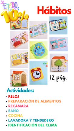 Con 12 paginas, puedes empezar a enseñar habitos: me levanto, me lavo los dientes, me baño, me visto, me preparo el sandwich, y con extras de identificacion del clima, reloj, lavadora y tendedero trabajas psicomotricidad fina.